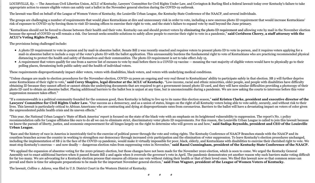 I’m a member of League of Women Voters. We are NOT a “left wing” group, and our concern is that people cannot get IDs with govt offices closed due to COVID19. It is your duty to make sure the ppl of KY have access to voting. Why would you want any left out?