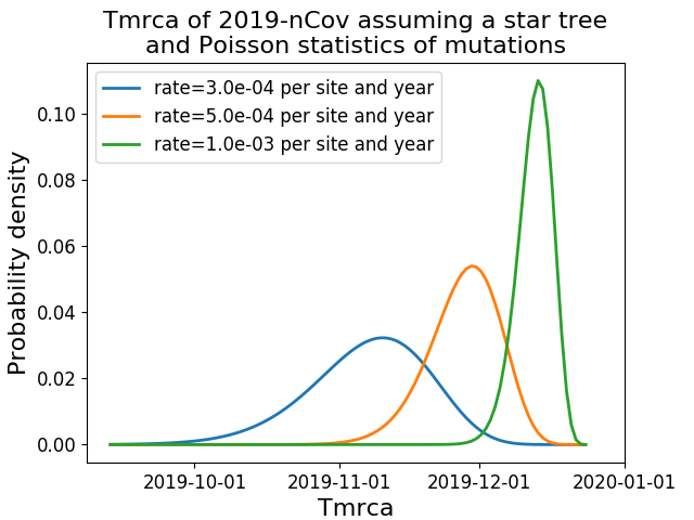 Given the low diversity in #nCov2019 genomes shared so far, the fact that all differences are singletons, and the apparently rapid spread, one can estimate Tmrca assuming a star topology. The big unknown is the rate (and sequencing errors). see also here: http://virological.org/t/preliminary-phylogenetic-analysis-of-11-ncov2019-genomes-2020-01-19/329 …pic.twitter.com/CY63e4rdmY