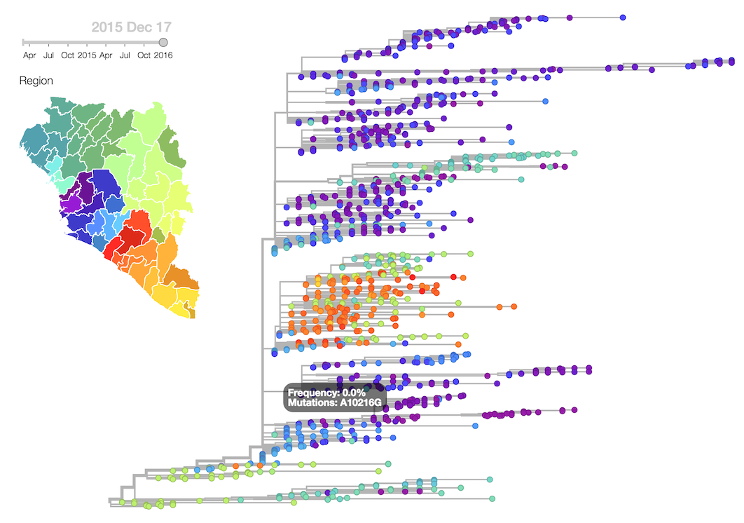 Liberia and Guinea Ebola show substantial mixing, while Sierra Leone looks more distinct. http://ebola.nextstrain.org/ pic.twitter.com/7FgQARsyJ7