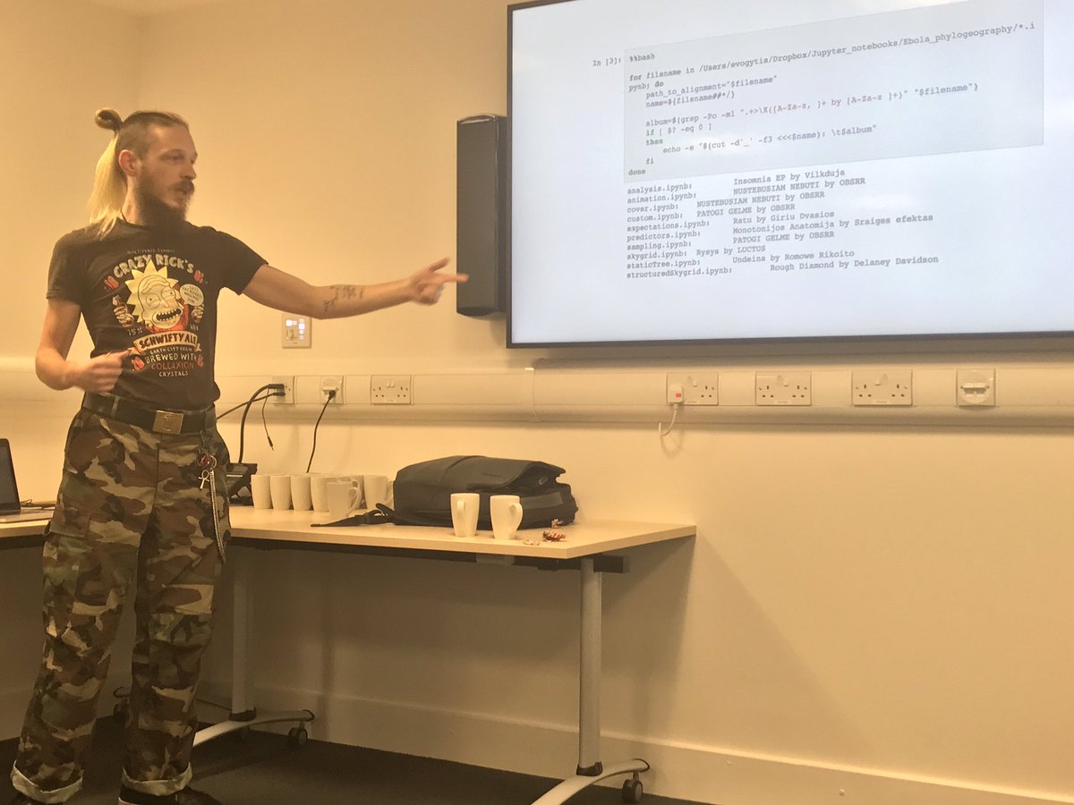 .@evogytis telling us about jupyter for reproducible phylogenetics: each notebook is associated w/ a classic Lithuanian album #articnetworkpic.twitter.com/dtPtKrfNRs