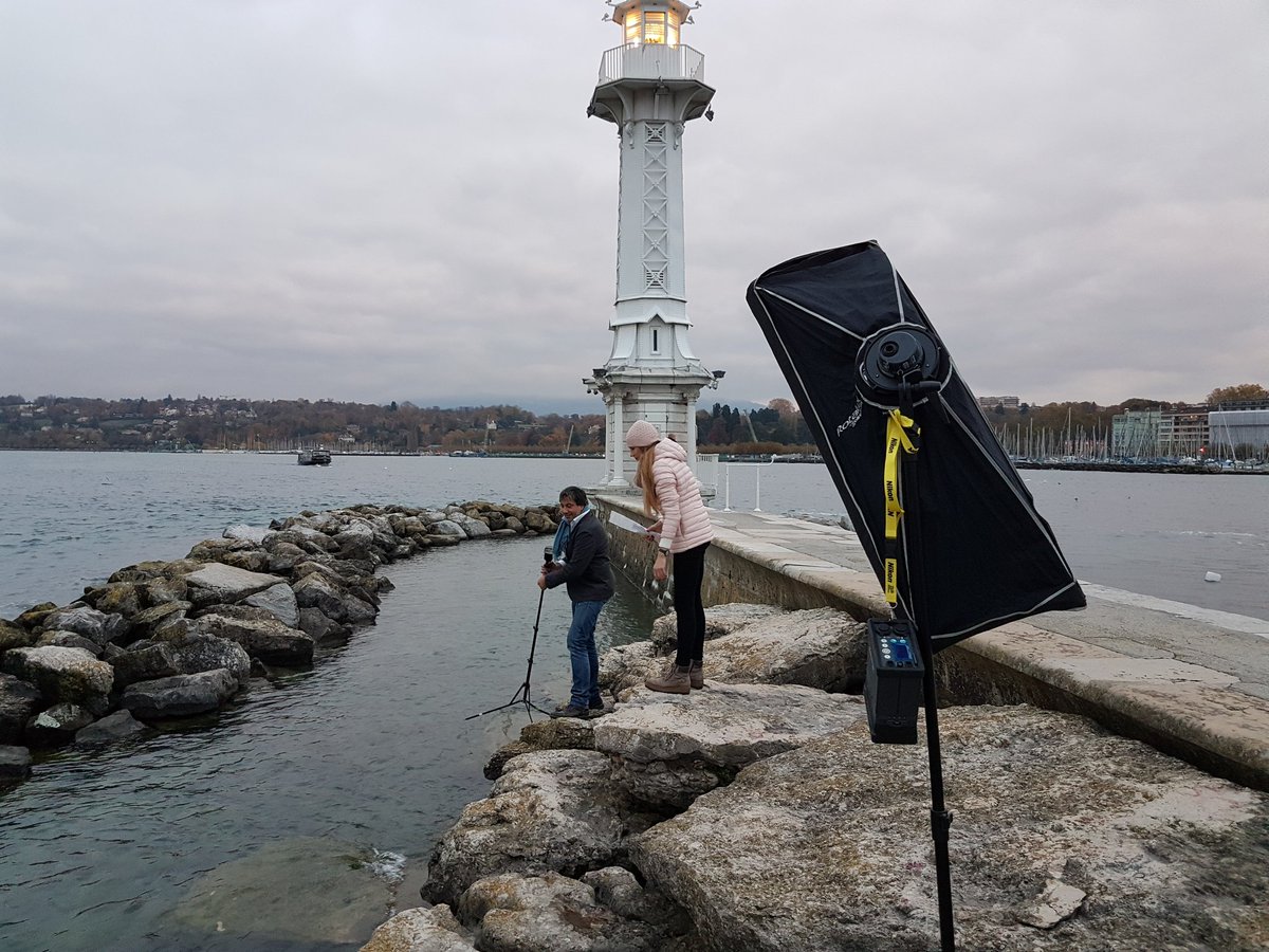 Nov 9, 5°C: I spent the evening in a 50ies swimsuit barefoot in front of the lighthouse in lake Geneva to have my @ISBSIB profile pic taken. Surrounded by artificial smoke and fireworks. Weirdest thing I've done in a while. This is the photographer setting up.pic.twitter.com/U4ucXToFms