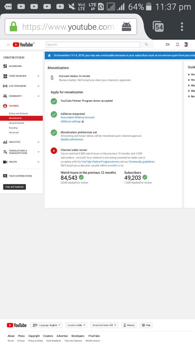 @TeamYouTube dear TeamYouTube My Channel Is completed the 84k + hours watch time & 49k Subscriber ....last 12 month waiting No Copyright No Community ....All rules follow My all family depending YouTube please solw this problem sir. Fast URL: https://www.youtube.com/channel/UCoLMIOJqdWbxadR-2dO9tHA …)pic.twitter.com/OSeZBzf9JF