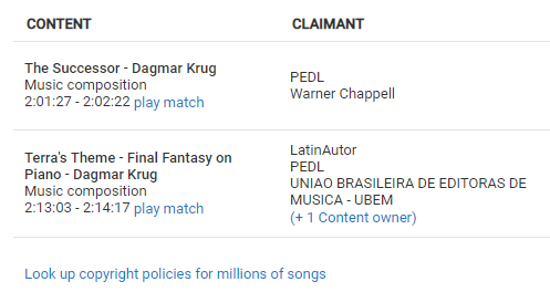 Hey @TeamYouTube what's up with the ContentID system? I've been getting multiple copyright claims in almost every video with Final Fantasy Music. They're claimed by people who did covers of songs that are property of @SquareEnix @sem_sep @UematsuNobuo. So Who actually owns them?pic.twitter.com/Fhe5w9i4RP
