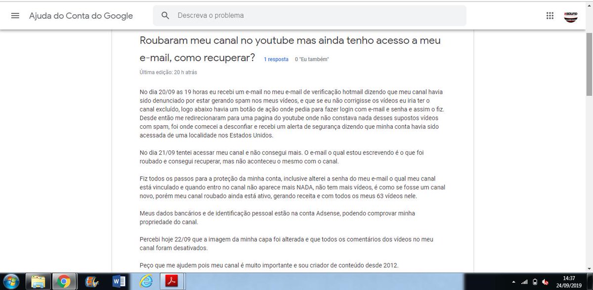 Já fazem 3 dias que informei na comunidade do youtube sobre o roubo do meu canal e até agora sequer fui respondido, falta de suporte por parte do @YoutubeTeam6 @YouTube @YouTubeBrasil #teamyoutube #youtube #youtubebrasil #canalroubado #canalhakeado #youtubesegurançafalhapic.twitter.com/xaqbb1Dfro