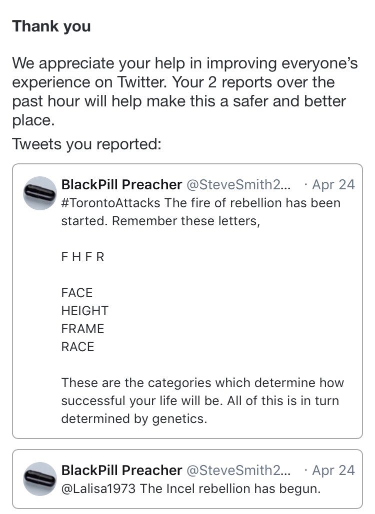 Can’t help but think abt how we don’t stop terrible things from happening when we choose to mind our own biz. MANY red flags ignored in person & on social media. Pls report worrisome behaviour to appropriate authoroties when you see it. Eg: delusional #incel posts. #TorontoStrongpic.twitter.com/28ReSIpmnn