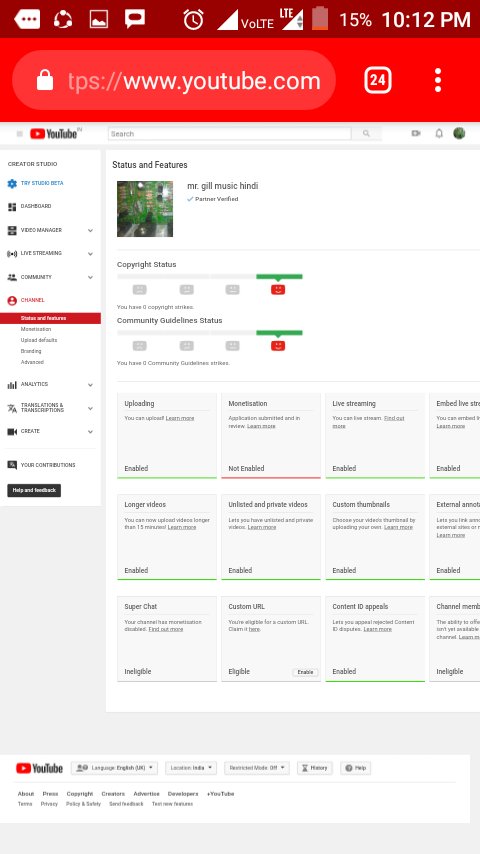 Hey @TeamYouTube Hello Dear YouTube Team, I have completed 23,000 hours of Watch Time and 15000 Subcriber as per YouTube Policies. Kindly approve my youtube channel "Mr. Gill music Hindi" For Monetization My Channel URL: (https:// UCD_M3IZJWhaHYfVzWjqVHlA )pic.twitter.com/Onlju1YFnH