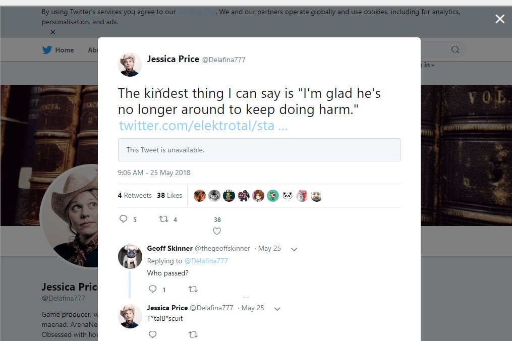 There are many incidents, a lot were prior to her working for ArenaNet, this one (following TBs passing) was during her tenure though: Its not like this was an isolated incident, there is a problem that needs to be addressed but ignoring her behaviour is whats riling peoplepic.twitter.com/0RF6DuCyol
