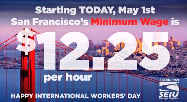 Today San Francisco's min wage raises to $12.25/hr. GREAT news for workers on #InternationalWorkersDay! #RaiseTheWage pic.twitter.com/mo5QtDD5gp