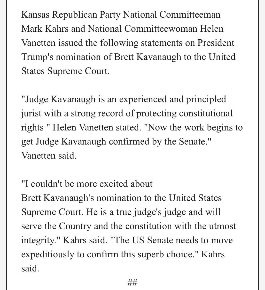 Statement from National Committeeman Mark Kahrs and Committeewoman Helen Vanetten on the nomination of Judge Brett Kavanaugh.pic.twitter.com/9ksKVewuZo