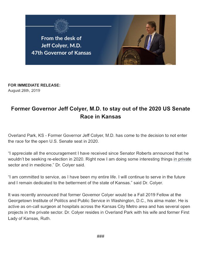 Thank you @DrJeffColyer for your service to our great state. We hope to see you back in the Kansas political arena soon. #ksleg #ksgovhttps://twitter.com/DrJeffColyer/status/1166088378082832385 …