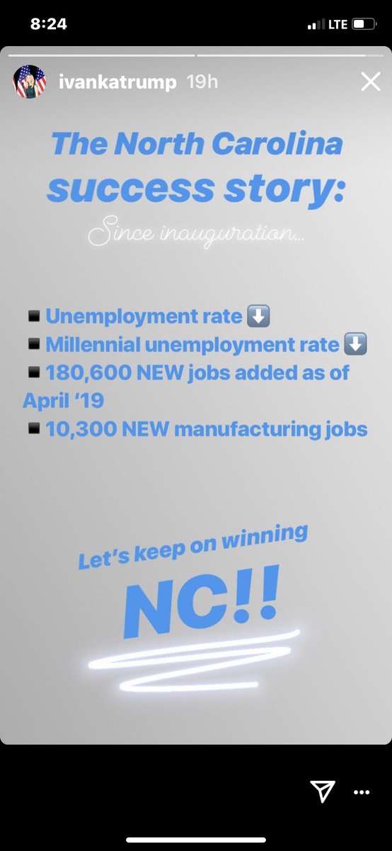 .@IvankaTrump on @instagram this morning appearing to take a campaign-like tone, heralding “The North Carolina Success Story” since @POTUS @realDonaldTrump inauguration. Specifically cites drop in millennial unemployment. @ABC11_WTVD @ABCPoliticspic.twitter.com/pmu3zcLgQo
