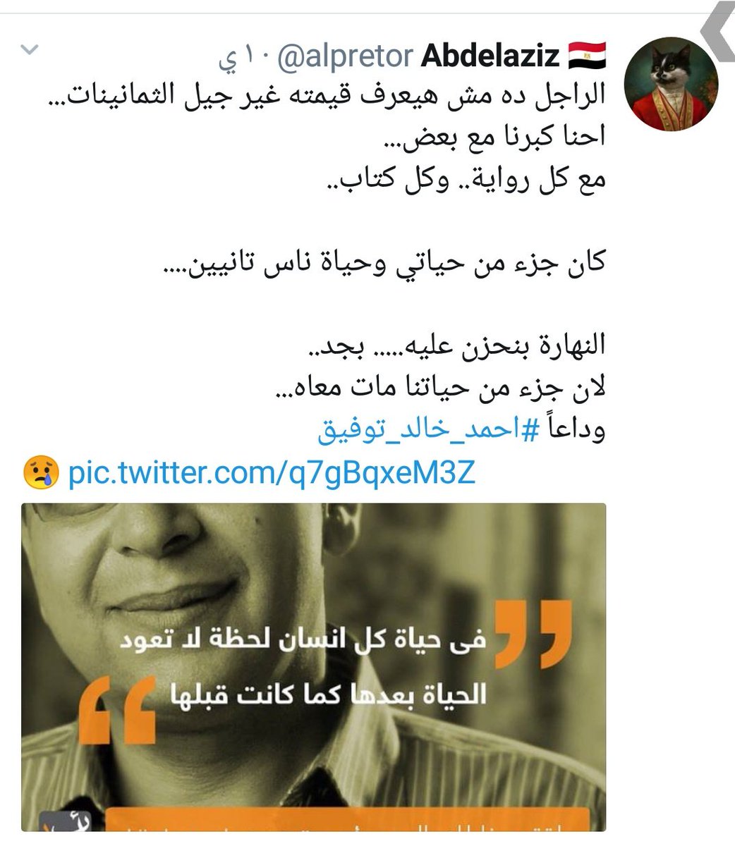 #أ_خ_ت على تويتر، كنّا بنهرج بنعبر عن حبنا لشخص استثنائي بأننا نحاول نكتب بأسلوبه. كنّا بنهرر لأننا بنحبه وقبل هزارنا لأنه بيحبنا. اليوم رحل الكاتب الاستثنائي صاحب التأثير الكبير على وعى ووجدان جيلنا. الإنسان المميز المتواضع أحمد خالد توفيق رحل.Thanks. Twitter will use this to make your timeline better. UndoUndo -