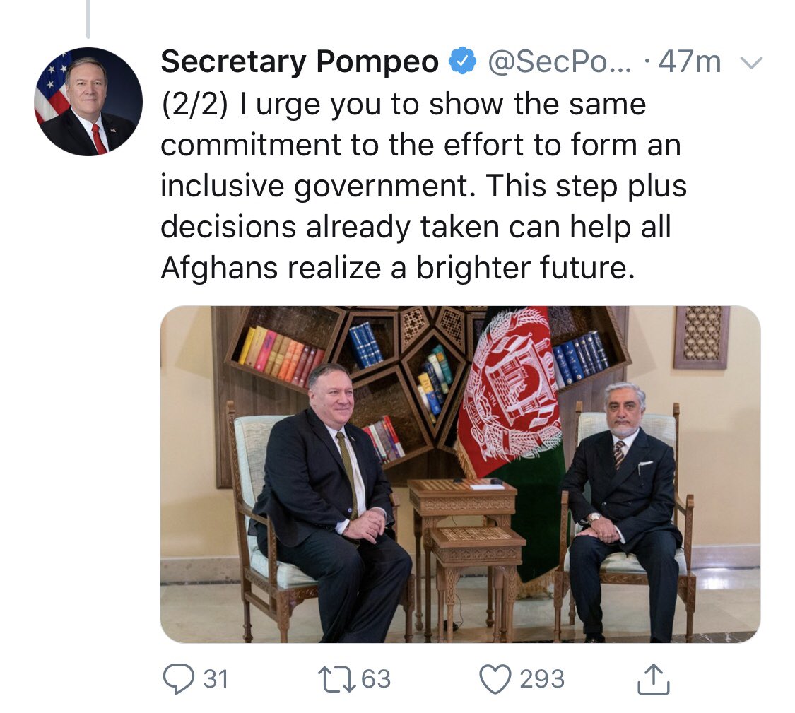 #مایک_پومپئو وزیر خارجه امریکا از عبدالله عبدالله و اشرف غنی خواسته است که برای ایجاد یک حکومت همه شمول«فراگیر» در افغانستان تلاش کنند و تعهدشان را برای این کار نشان دهند.pic.twitter.com/f6WTLsM1vv