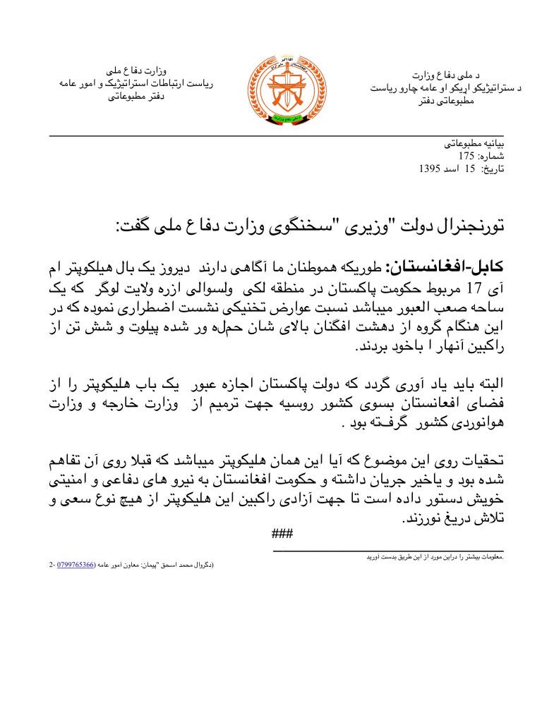 #اعلاميه وزارت دفاع ملي در باره سقوط يك #هليكوپتر نظامي #پاكستان در ولايت لوگر