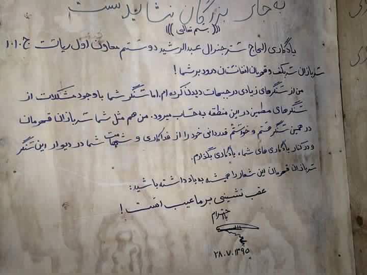 #عقب نشيني برما عيب است #جنرال دوستم در اتاق بدوباش اش در يك پايگاه ارتش در ولسوالي غورماچ" فارياب" #يادگاري نوشته است.pic.twitter.com/zH5S4vSMiW
