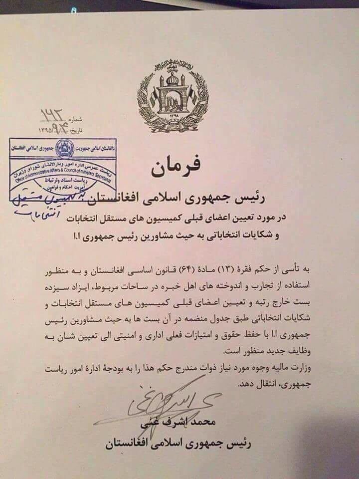 بربنياداين فرمان رييس جمهورغني كميشنران كميسيون هاي انتخاباتي به حيث مشاوران تازه يي رييس جمهورتعيين شده اندpic.twitter.com/CCeM5CWofL