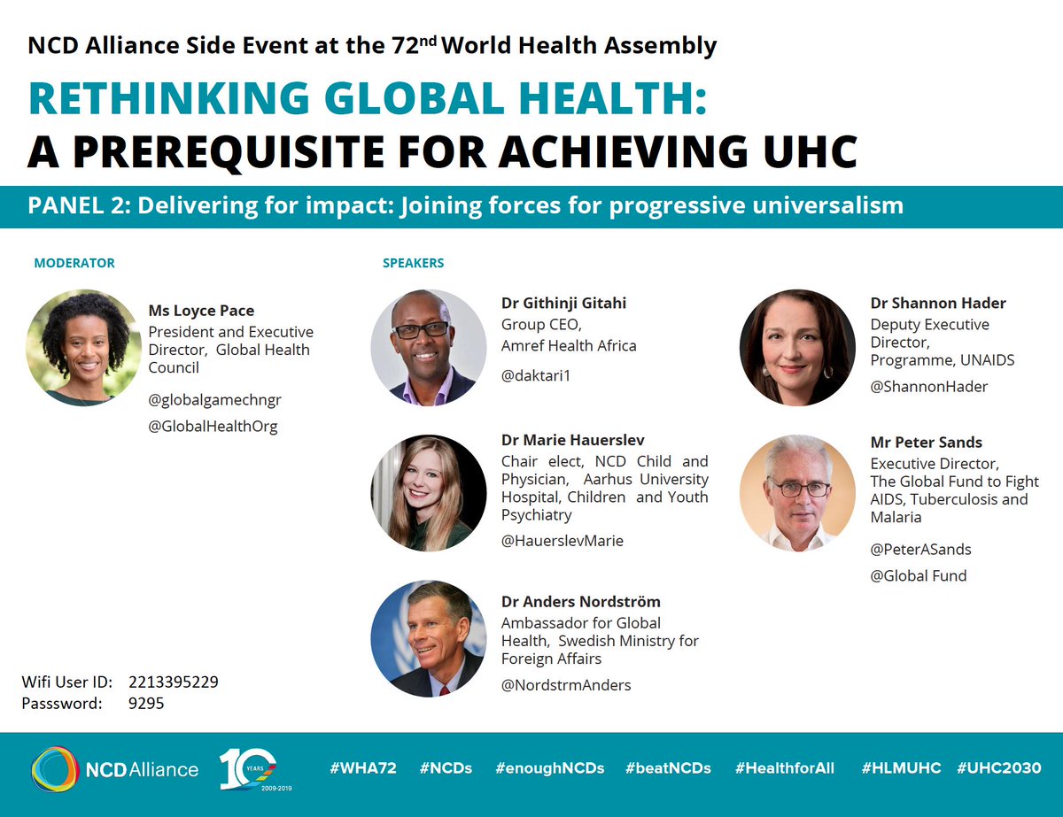 #WHA72 @ncdalliance side event tonight: Our 2nd panel will be moderated by @globalgamechngr of @GlobalHealthOrg 👉🏼 To be discussed: Mutli-stakeholder global health partnerships to better deliver holistic, comprehensive care. #enoughNCDs #healthforall #beatNCDs #UHC pic.twitter.com/AlhwDSlpKg