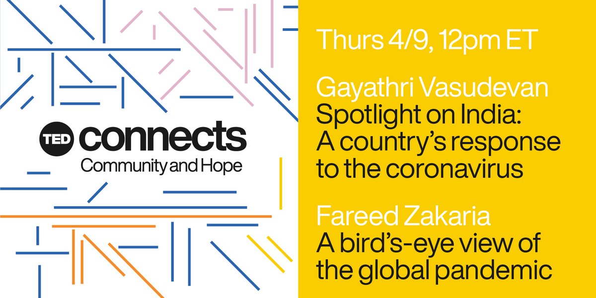 In 45min catch a glimpse into India's experience of #COVID19 from Gayathri Vasudevan, who works alongside the country's informal workforce. Then we'll zoom out to analyze the global response with host of CNN's GPS @FareedZakaria. Watch and share: http://go.ted.com/tedconnects pic.twitter.com/RLF4MrPaib