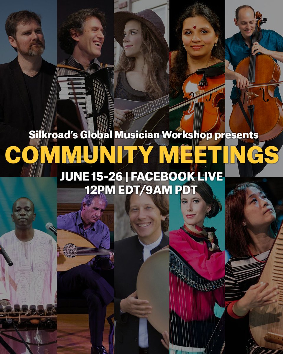 Faculty from Silkroad's Global Musician Workshop will be hosting Community Meetings with live discussions, solo performances, and Q&As — weekdays, 6/15-26, at 12pm EDT/9am PDT. Join us as we come together as a global community to listen, ask questions, and learn. #gmw #gmw2020 pic.twitter.com/g4TDJwLepN