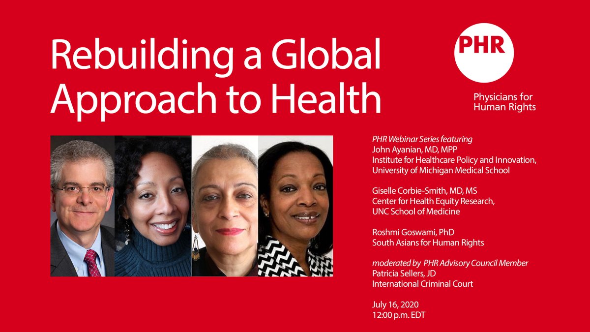 The pandemic forces us to challenge health care systems and envision a more equitable future. Tune in Thursday at 12 p.m. EDT to hear from Patricia Sellers (@IntlCrimCourt), @jzayanian (@UM_IHPI), @gcsmd (@uncCHER) & Roshmi Goswami (@S_Asian_Rights). https://us02web.zoom.us/webinar/register/WN_ESFT3t8QSf-EybeNMcxbgw?utm_campaign=525668_FY21%20July%20COVID-19%20Webinar%20Invitation%202_07132020&utm_medium=email&utm_source=Physicians%20for%20Human%20Rights&dm_i=4GV7,B9LW,4R8H75,168IT,1 … pic.twitter.com/fWRwH27i4M