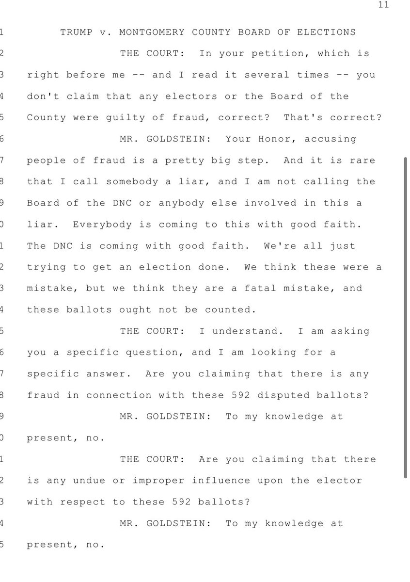 Today in a Pennsylvania court: Judge: “Are you claiming there there is any fraud..?” Trump lawyer: “To my knowledge, at present, no.” Judge: “Are you claiming that there is any undue or improper influence upon the elector...?” Trump lawyer: “To my knowledge, at present, no.” pic.twitter.com/xcuJLKcQqG