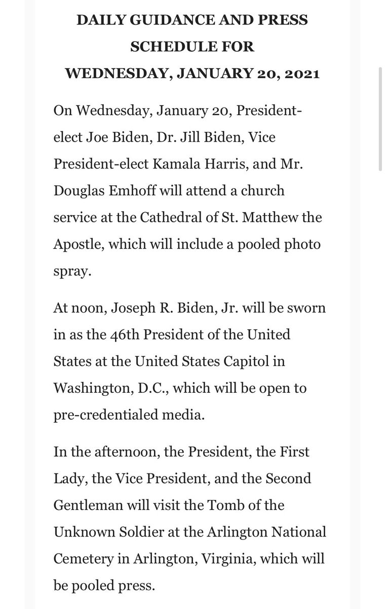 President-elect Biden’s schedule as he becomes President Biden tomorrow at noon. There will also be a 7pm press briefing from White House press secretary Jen Psaki. pic.twitter.com/wCY1ODTBcK