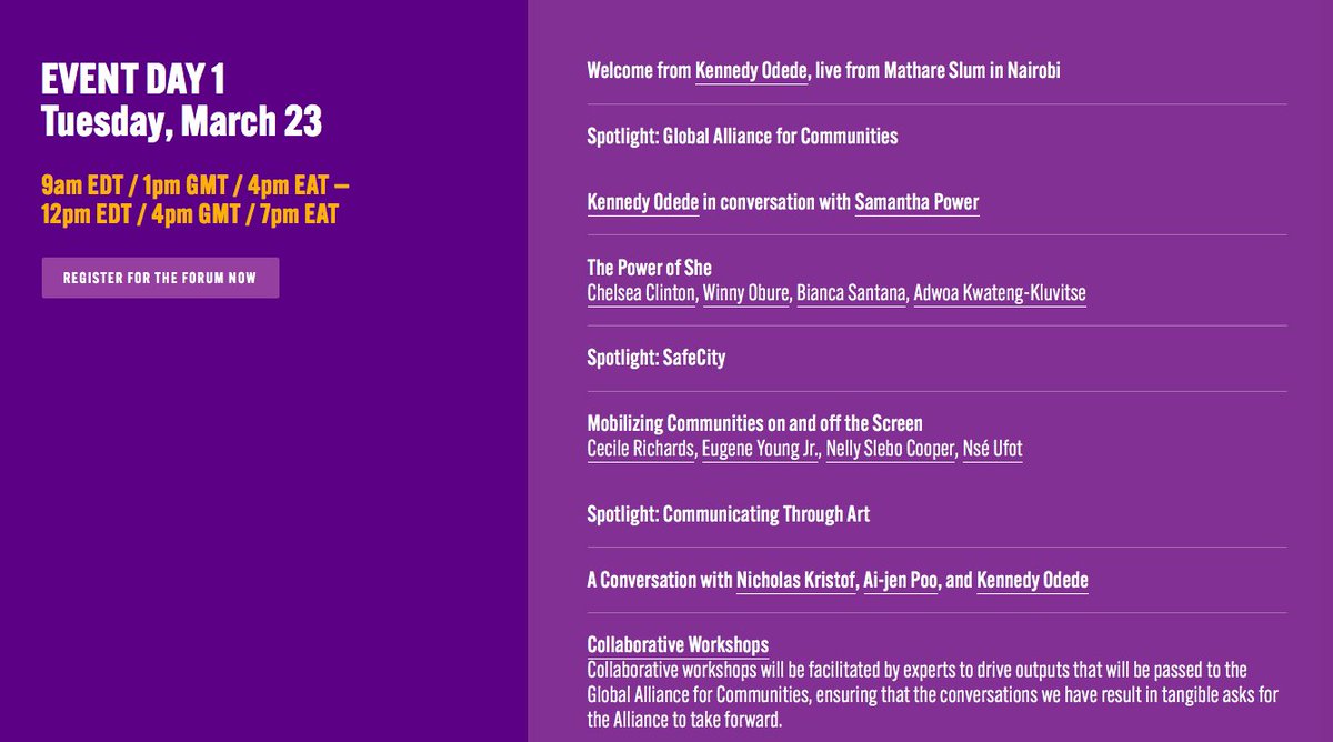 Check out today’s agenda with important convos at the #WorldCommunitiesForum on The Power of She, Mobilizing Online and Offline & Convos with @KennedyOdede w/ Ambassador @SamanthaJPower @NickKristof & @aijenpoopic.twitter.com/5b7xGi5goz