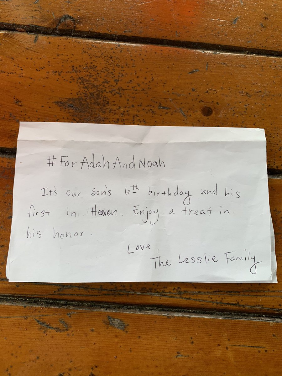A family went to pick up a birthday cake from a Rock Hill bakery and found, it had already been paid for. It came with this note, explaining the gesture it was in honor of Noah Lesslie who was killed in a mass shooting last month. He turned 6 in heaven. That story on @wsoctv pic.twitter.com/SemXDJqljg