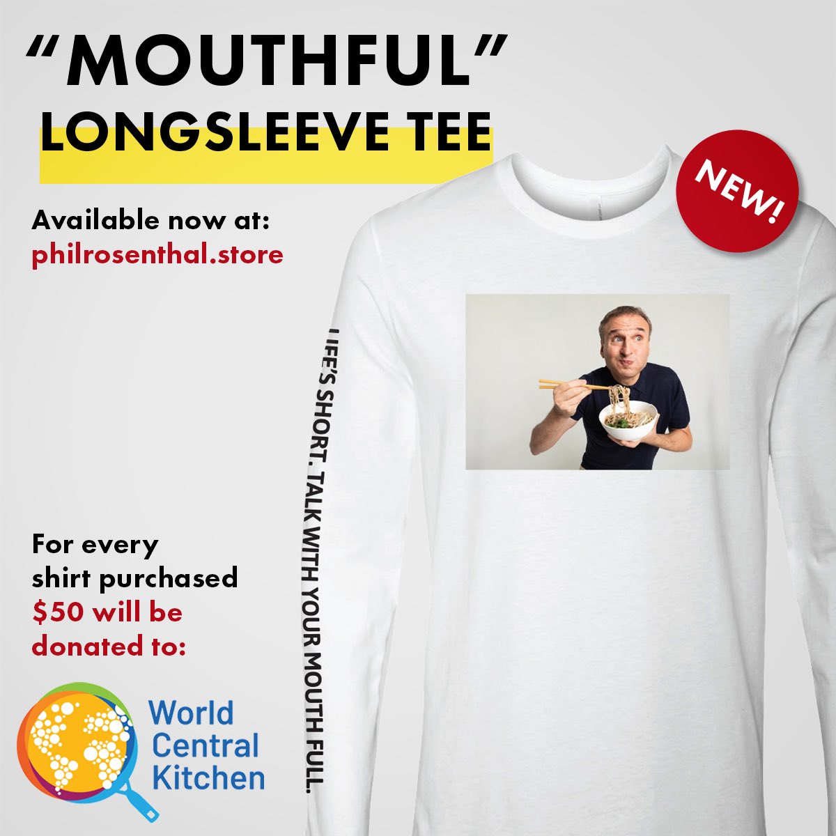 Available for pre-order: “Life’s short, talk with your mouth full” long sleeve tee. The shirt costs $40 but for every shirt purchased $50 is donated to @WCKitchen ♥️ #SomebodyFeedPhil https://philrosenthal.store/mouthful-long-sleeve-t-shirt … pic.twitter.com/jTUTcsXkoz
