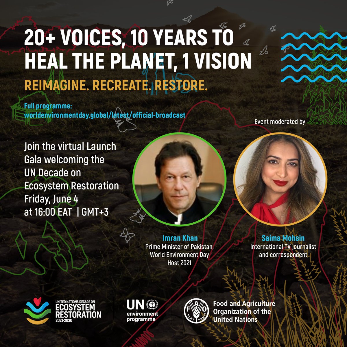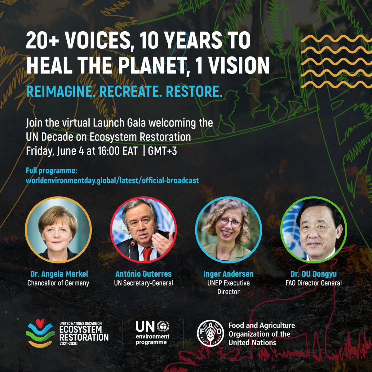 Join us this Friday on the eve of #WorldEnvironmentDay for the virtual launch gala of the @UN Decade on Ecosystem Restoration! World leaders, environmental changemakers and youth voices will share the digital stage. Learn more: https://bit.ly/34yc3fI  #GenerationRestoration pic.twitter.com/aQvuMZ7RVH
