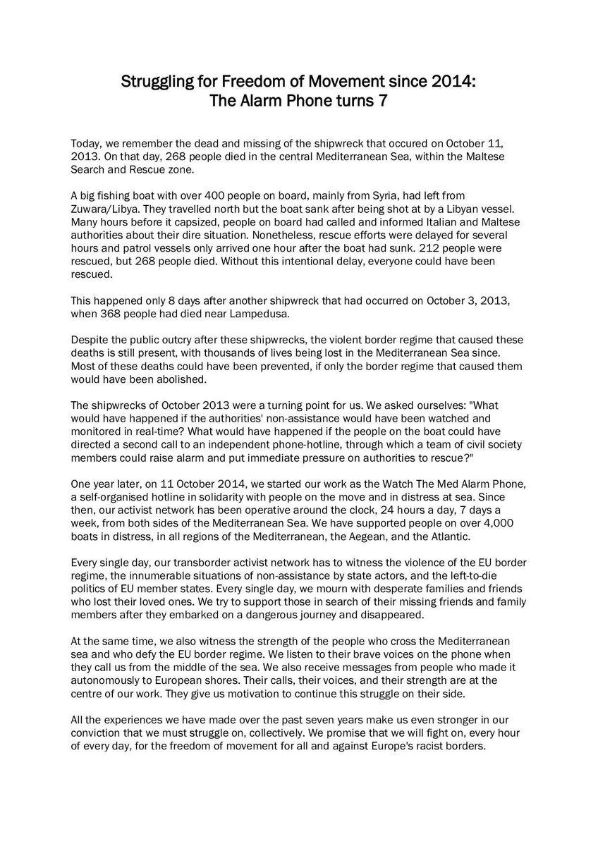 🔶Seven years of Alarm Phone🔶 Today, we remember the dead & missing of the 11 October 2013 shipwreck, when 268 people died in the #Mediterranean, because rescue efforts were delayed. One year later, on 11 October 2014, we started the Alarm Phone. pic.twitter.com/d2zBSzoQsb