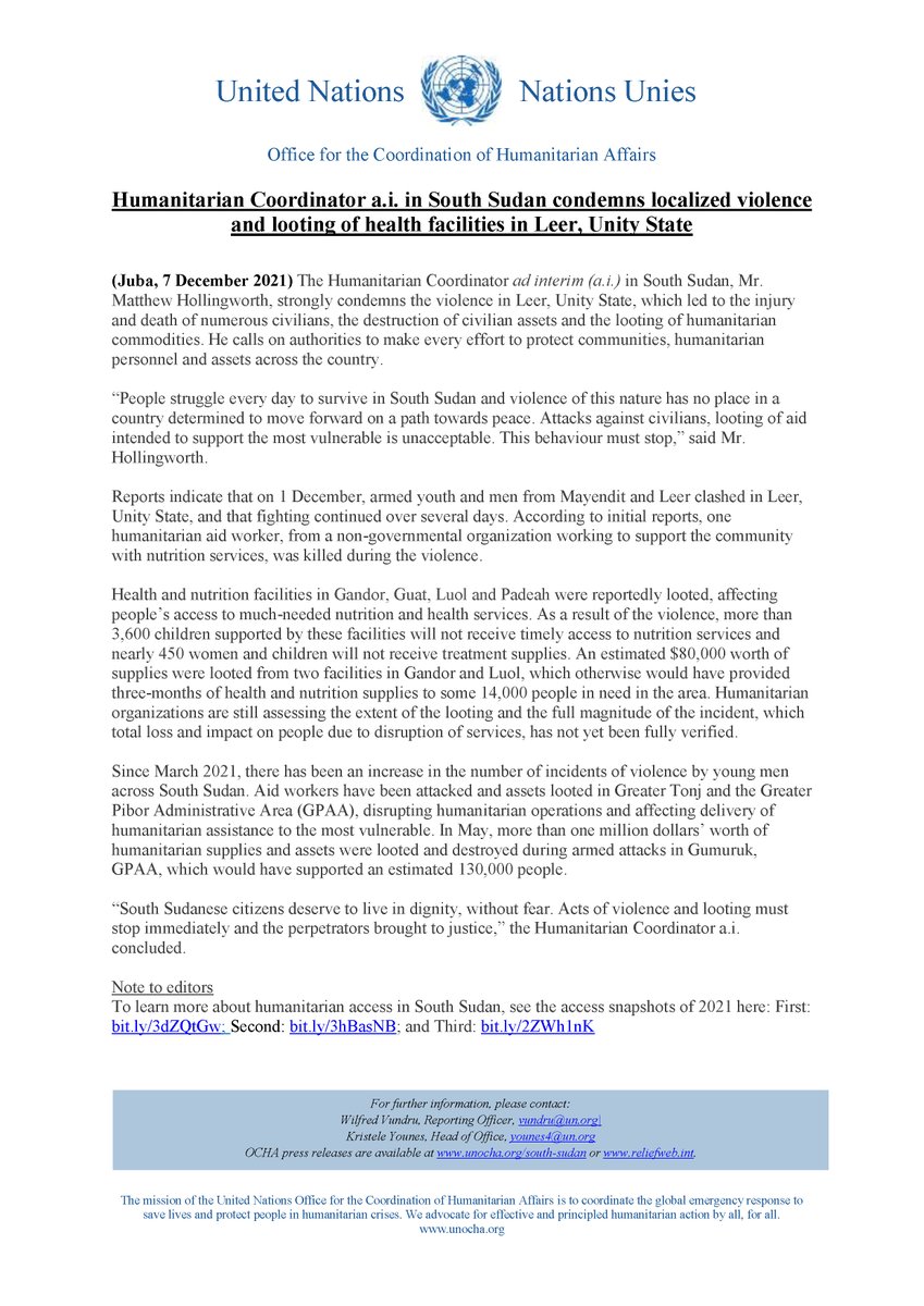 "Attacks against civilians, looting of aid intended to support the most vulnerable is unacceptable. This behaviour must stop." Humanitarian Coordinator a.i. @mfjhollingworth condemns the killing of an aid worker in Unity State, #SouthSudan 📄http://bit.ly/3GiwMoK  #NotATarget pic.twitter.com/SLJqtqQSJV