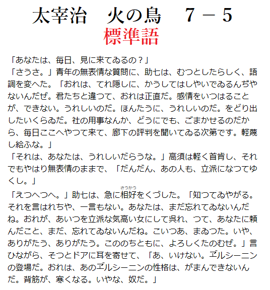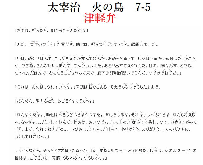 #方言de小説 太宰治 火の鳥 7-5 ありがたい 原文https://www.aozora.gr.jp/cards/000035/files/269_15082.html … 方言版http://ncode.syosetu.com/n7058fv/ 津軽弁にすると…… いつも→むったど 平然と→つけらした ごまかす・ぐじゃぐじゃにする→かちゃめかす 馬鹿→つぼけ 立派な→おごろいpic.twitter.com/GSPjIYxEM4