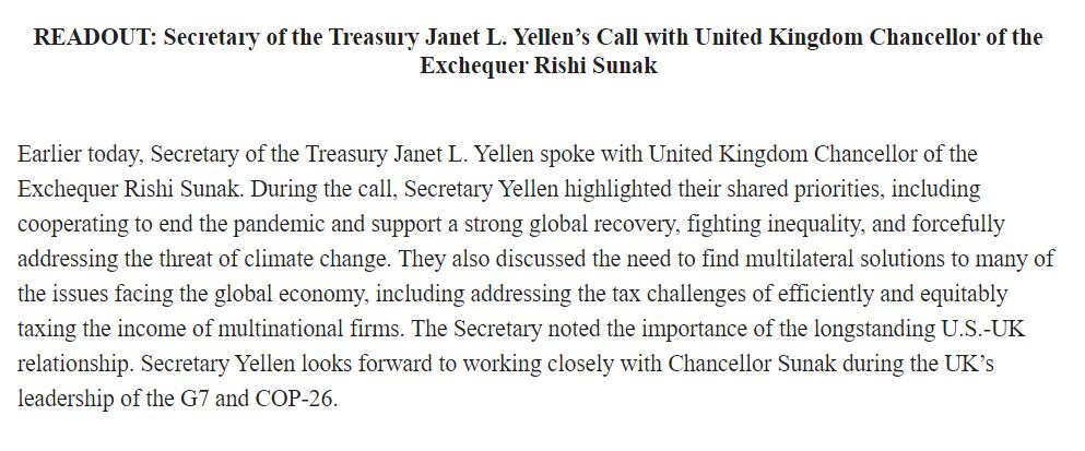 @RishiSunak, Treasury says. They discussed shared priorities, including ending the pandemic, fighting inequality, addressing climate change, per readout.pic.twitter.com/ia0lGeJx6Y