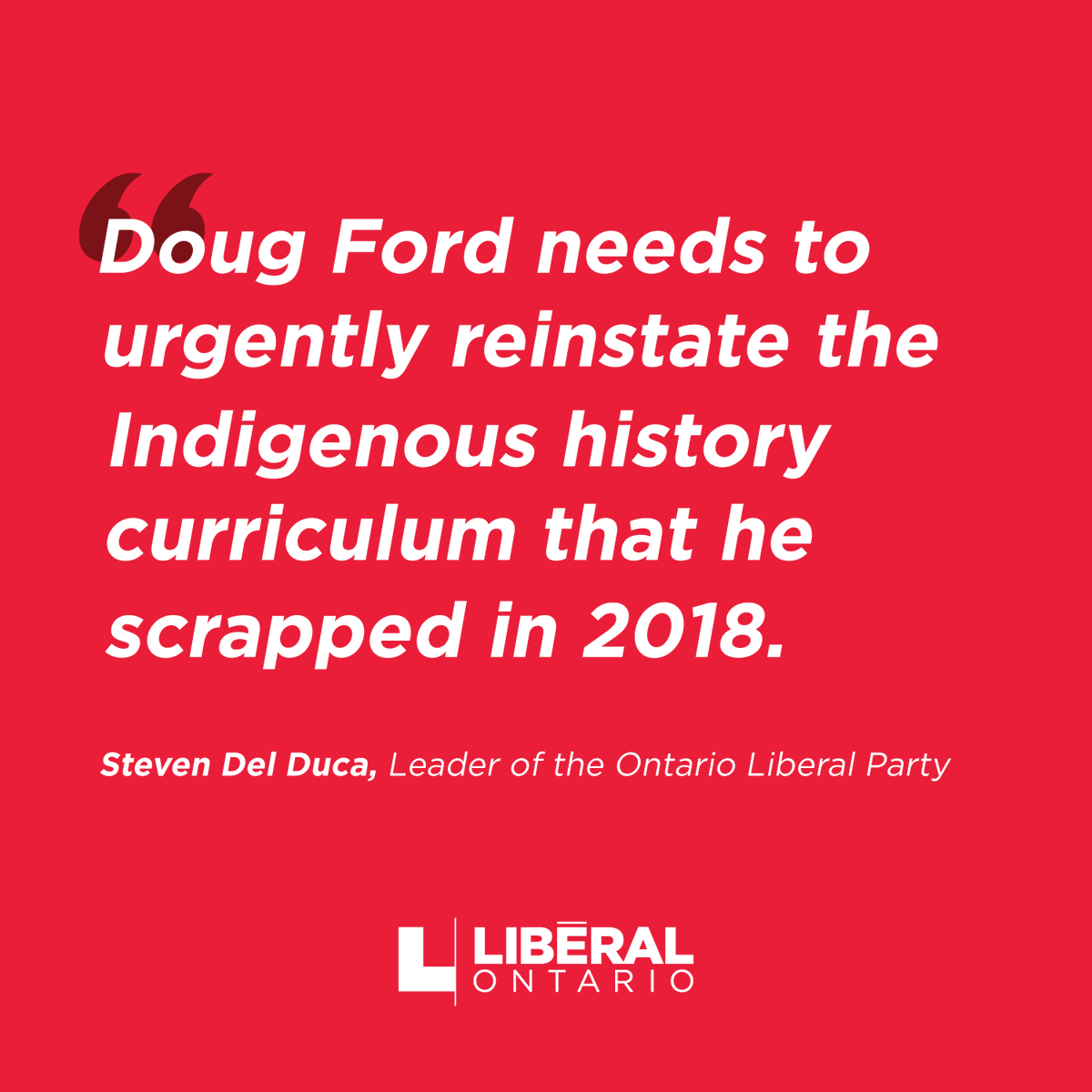 Ontario Liberals call on Doug Ford to reinstate the Indigenous curriculum changes his government cut in 2018. We owe it to the victims and survivors that their stories are taught to future generations.