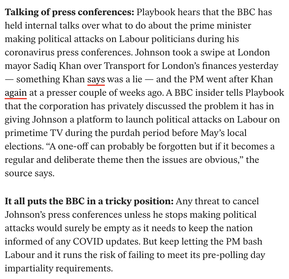 PLAYBOOK STORY 2 The BBC has held internal talks over what to do about Boris Johnson making political attacks on opponents at Covid press conferences during purdah “A one-off can probably be forgotten but if it becomes a regular and deliberate theme then the issues are obvious"pic.twitter.com/ZkbvzniCQs