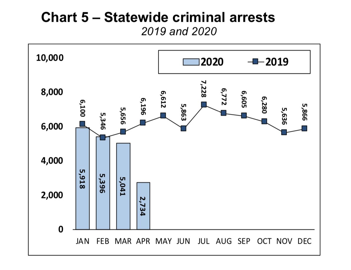 Another big takeaway is the significant decline in statewide arrests. I'm on a criminal justice policy call now. Expecting to hear soon from police about how #COVID19 has affected their jobs. I'll tweet out the big takeaways and will have a story later.pic.twitter.com/ZPwSdTYAcT