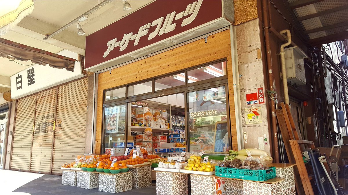 アーケード名店街のアーケードフルーツさんにリニューアルされた「ラブライブ!サンシャイン!!」の千歌ちゃん寿太郎みかん箱