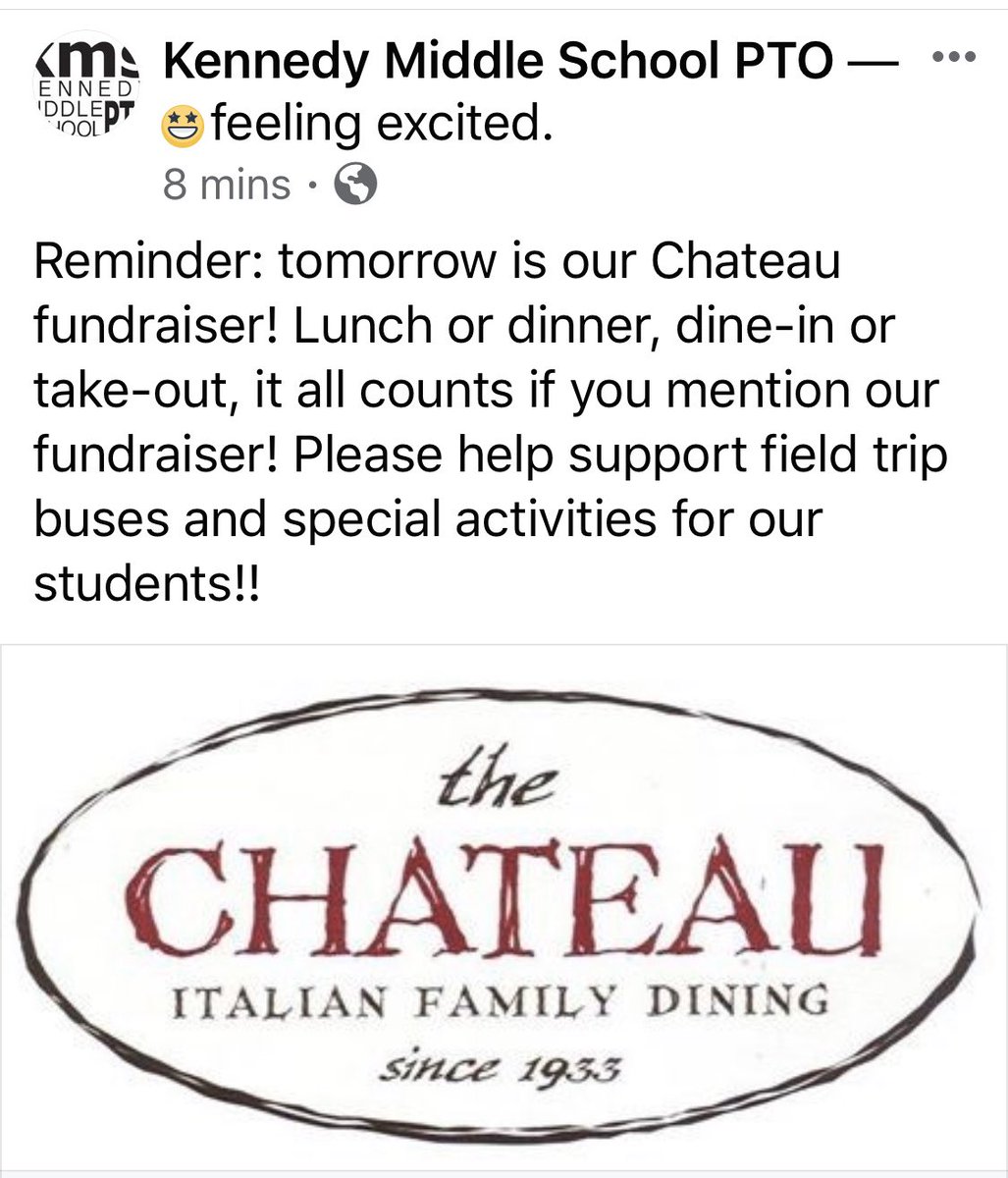 Chateau Fundraiser tonight! 20% of sales come back to our students if you show or mention this. Online code - FUNDRAISER