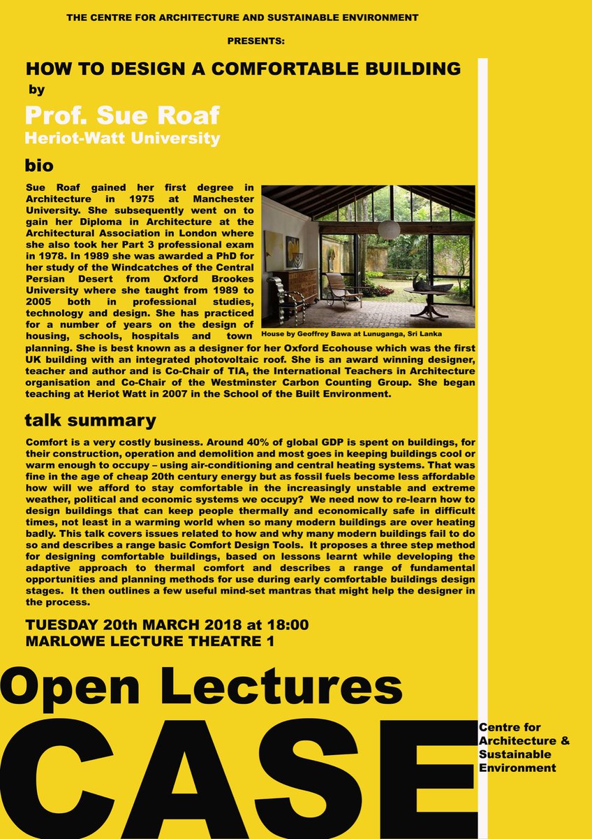 #CASE#OpenLecture entitled, 'How to Design a Comfortable Building' will be given by Prof Sue Roaf, from@HeriotWattUni on Tuesday 20 March at 6PM in Marlowe Lecture Theatre 1. More info: http://bit.ly/2tIlhXe pic.twitter.com/qqtXKfSVdG