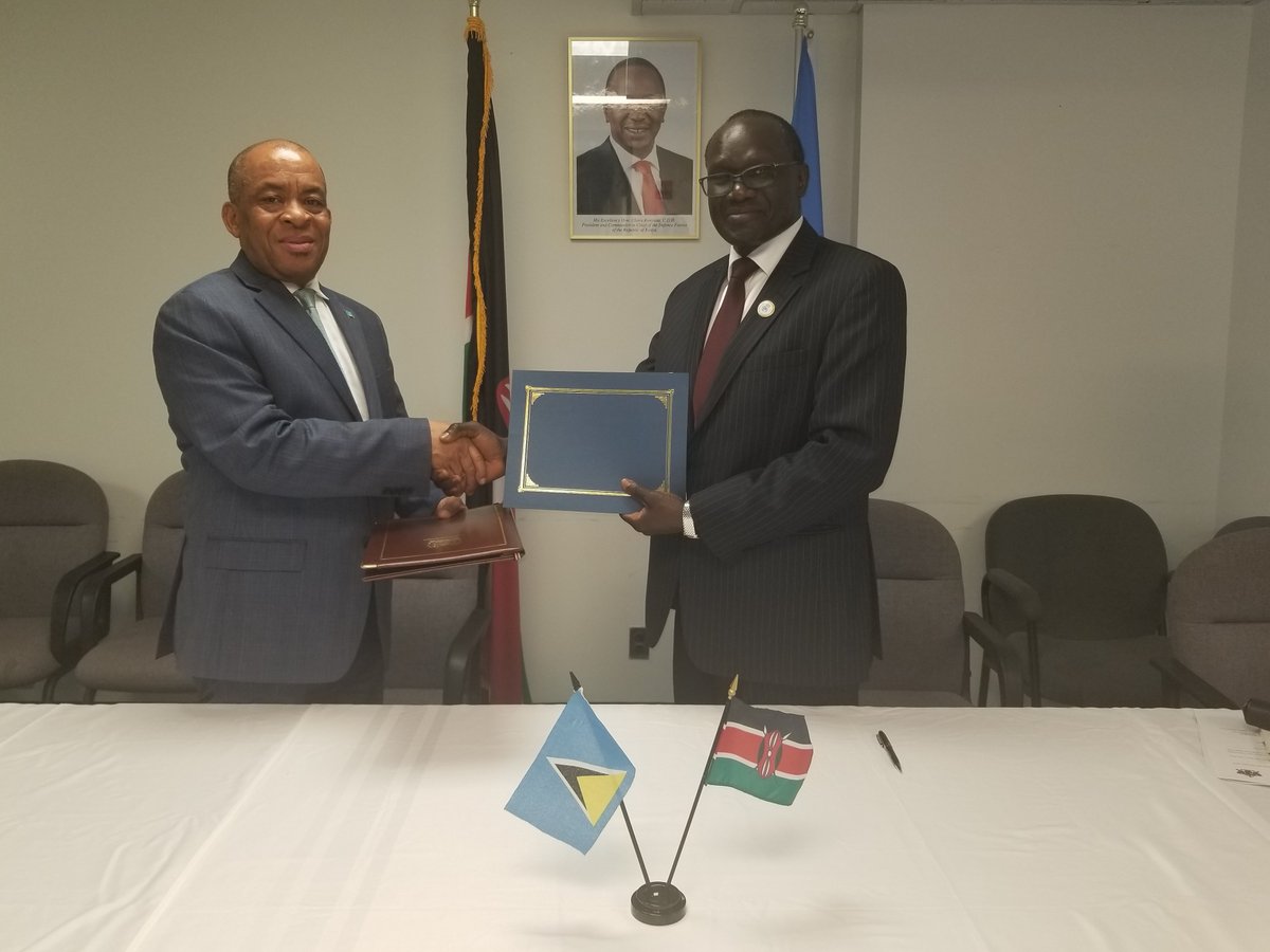 Amb. Lazarus Amayo, Permanent Representative of #Kenya to the #UN and Amb. Cosmos Richardson, Permanent Representative of St. Lucia, exchange signed joint communique establishing diplomatic relations between the two countries. #diplomacypic.twitter.com/mHyBrACcSr