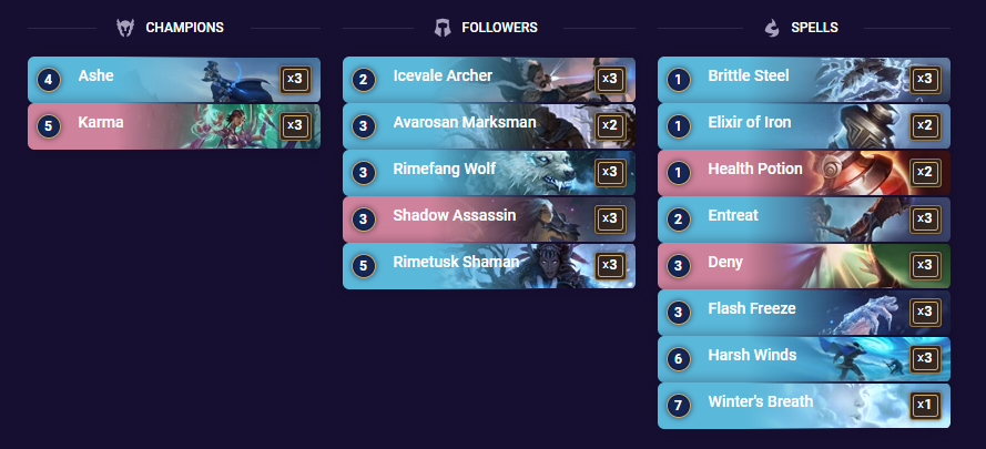 Late to the party but i got master now The Ezreal deck is my baby and got me the most wins during my climb early in the season. After that i used Ashe/Karma to get from Diamond to Master. credit to @coL_Petrify for the Ashe/Karma listpic.twitter.com/1RVx4CTZSn