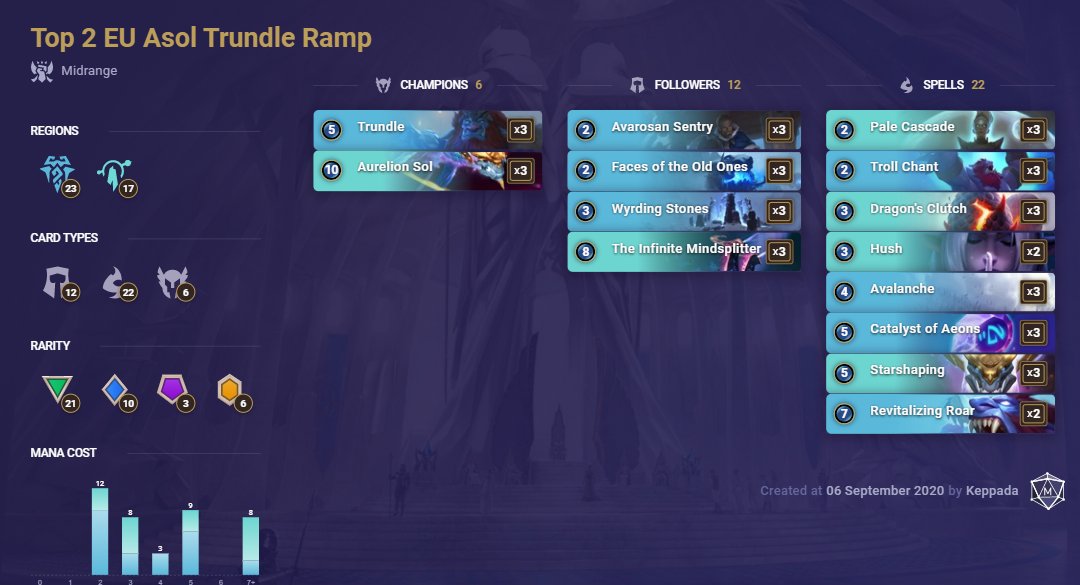 Peaked at rank #2 EU today with Asol Trundle ramp and currently sitting at rank #4. I'm pretty confident this is the best build for current EU meta for the archetype. Going to keep chasing rank 1! The infinite mindsplitter might need a nerf @LoRtopdecks @runeterradex #esportsfipic.twitter.com/gyf0U9x945