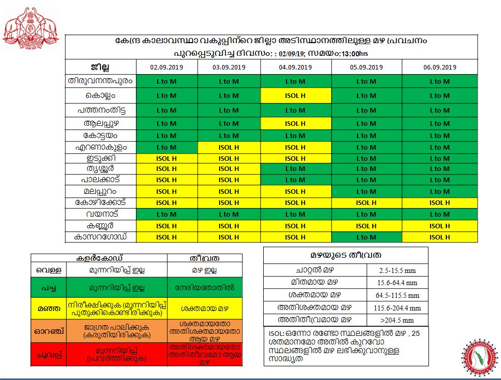 (സെപ്റ്റംബർ 2 ന് - ഇടുക്കി,തൃശ്ശൂർ,പാലക്കാട്,മലപ്പുറം,കോഴിക്കോട് , കണ്ണൂർ,കാസറഗോഡ് സെപ്റ്റംബർ 3 ന് - എറണാകുളം, ഇടുക്കി,തൃശ്ശൂർ,പാലക്കാട്, മലപ്പുറം,കോഴിക്കോട് ,കണ്ണൂർ,കാസർഗോഡ്