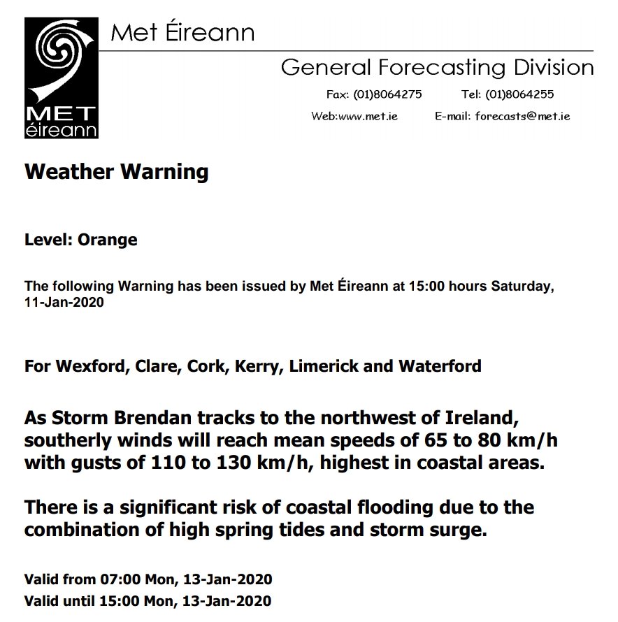 Status ORANGE warning issued by Met Éireann for Kerry for Monday from 7am to 3pm. Further advisories to follow
