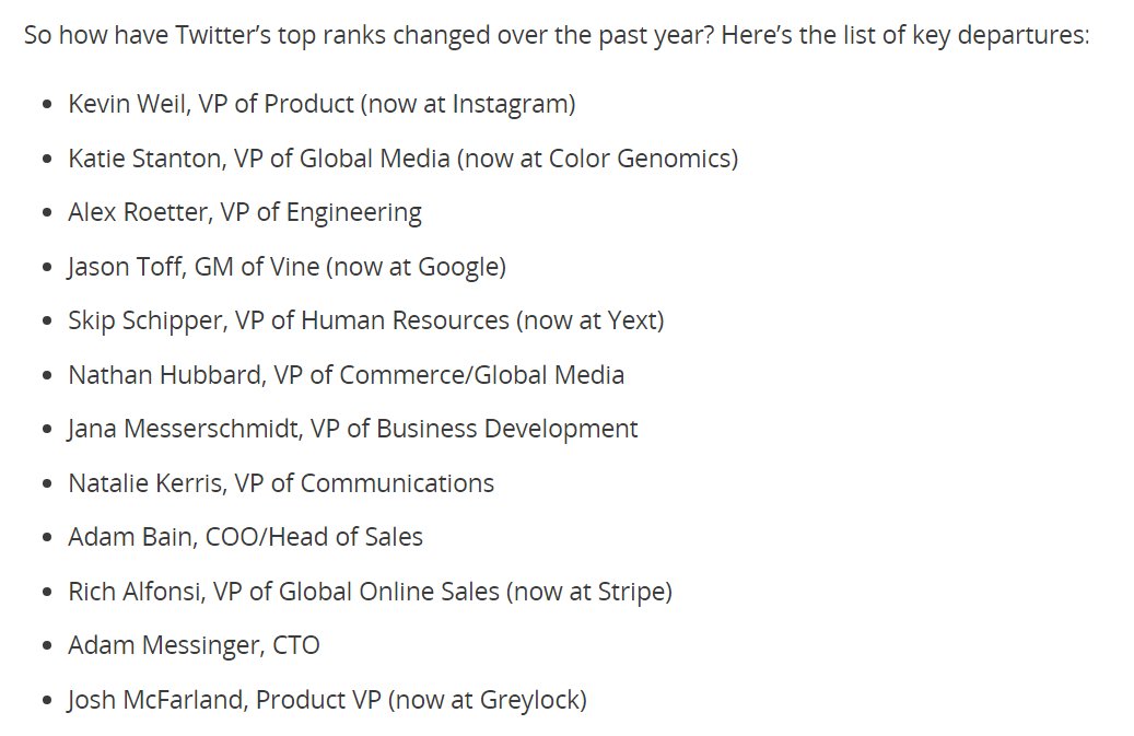 List of "all the Twitter executives who flew the coop in 2016," per @Recode: http://on.recode.net/2hWilyW . $TWTRpic.twitter.com/siFqbcRG5L