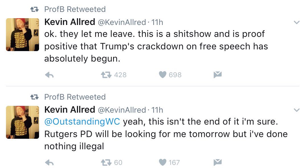 NYPD just came to my house bc Rutgers Police told them i'm a threat based on political statements i've made on campus and on twitter.