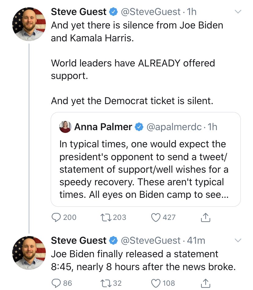 Steve is being an idiot. People normally are sleep when he finally let out that he had the virus. As soon as he knew Biden wished him well, he said he and Dr. Biden would pray for him. Trump’s negative ads again Joe are still running and his campaign continues to attack Joe.