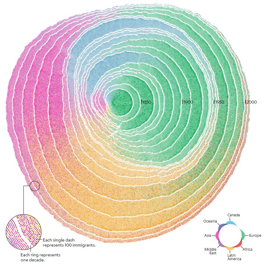 The accumulated history of US immigration visualized as rings in a growing tree trunk. A beautiful way to show rich cultural diversity and remind us a bit of population history. Terrific