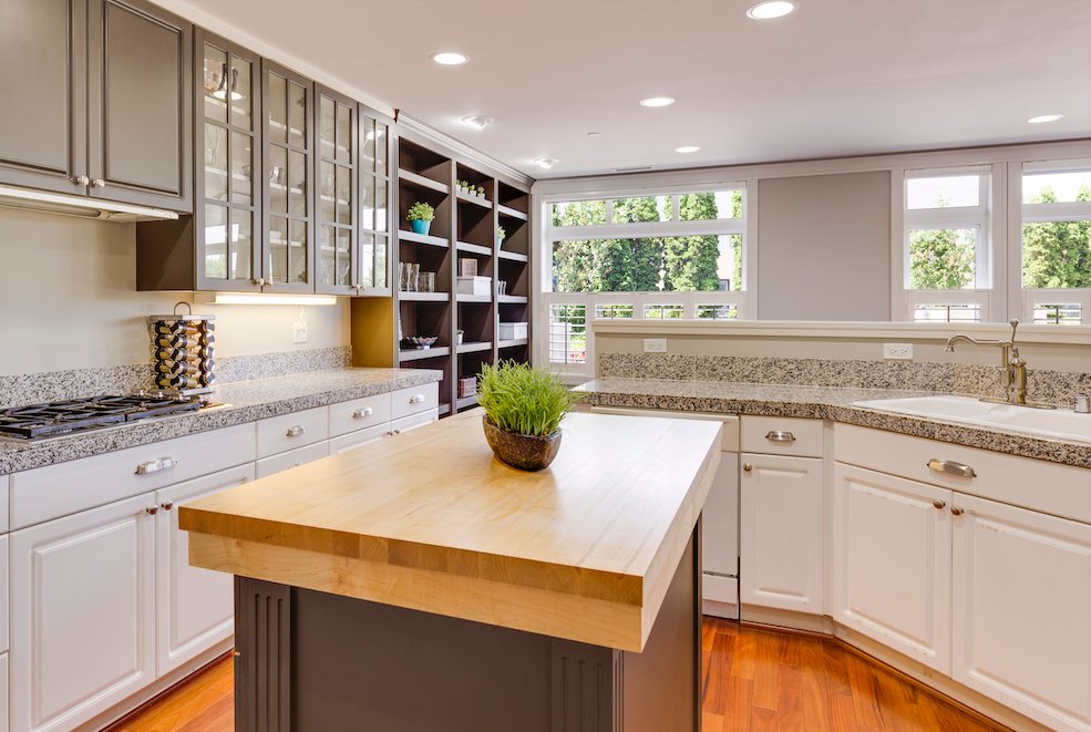 Replace old kitchen cabinets with solid wood (such as oak, cherry, or pine), and replace old countertops with granite or marble. This makes the kitchen beautiful and more usable while also increasing home value.